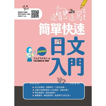 不要因為記不住50音,就對日文裹足不前!本書搭配作者親錄、好記有趣的50音發音解說,用「聽」+「寫」的方式,讓你無壓力地記住50音,接著再用同樣方式進一步學習日文基礎的單字與句型,讓你一舉跨過日文學習門檻,入門日文,真的一點也不難!